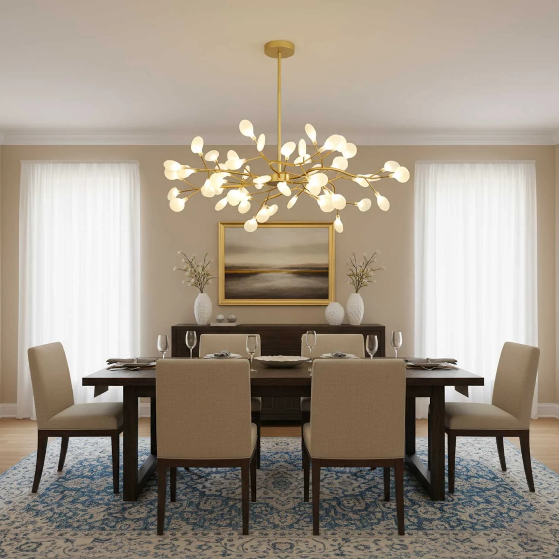 Der Firefly LED-Kronleuchter verbindet skulpturale Form mit weichem Licht: Zahlreiche LED-Punkte sind entlang filigraner Metallarme verteilt, sodass ein faszinierendes Lichtspiel entsteht, das zugleich funktional und dekorativ wirkt. Diese Lichtinstallation eignet sich besonders für Wohnzimmer, Esszimmer oder hohe Eingangsbereiche, wo sie zum optischen Mittelpunkt wird.