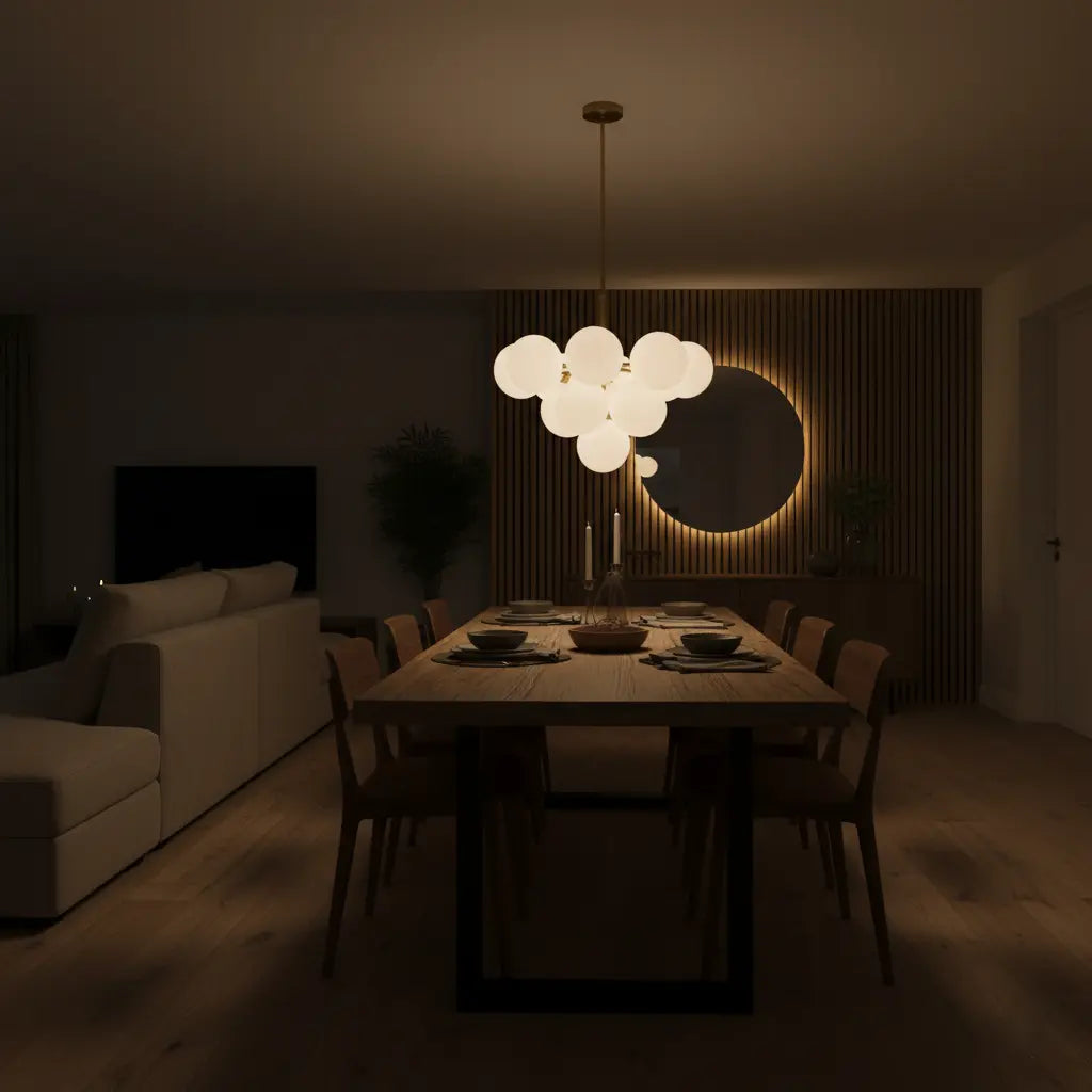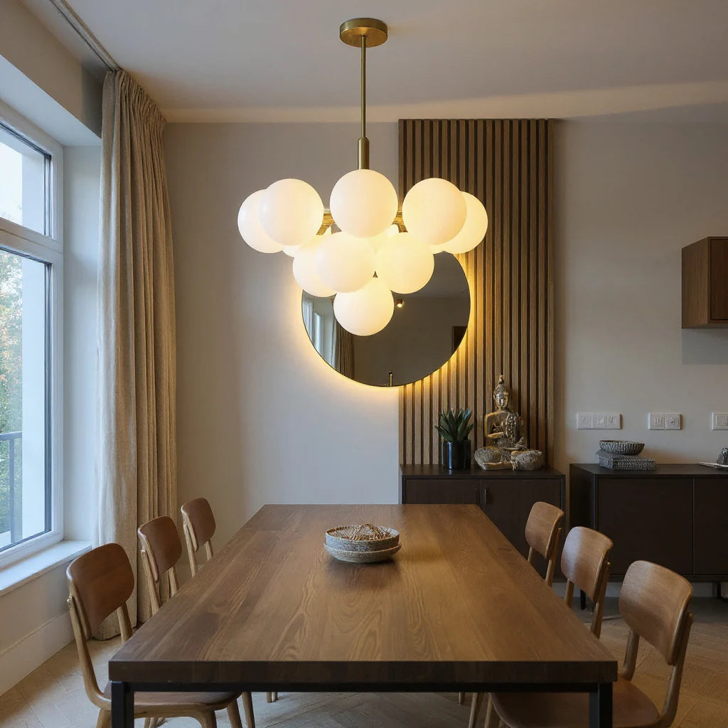 Diese Pendelleuchte mit Glasbällen verbreitet ein angenehmes, direktes und funktionales Licht und setzt dekorative Akzente in Ihrem Wohnraum. Die Design-Leuchte ist in mehreren Varianten erhältlich (5- oder 13-flammig) und eignet sich perfekt für Wohnzimmer, Esszimmer, Schlafzimmer, Flur, Mezzanin, Büro oder Arbeitszimmer – egal ob über Esstisch, Lounge-Bereich oder in offenen Wohnlandschaften.