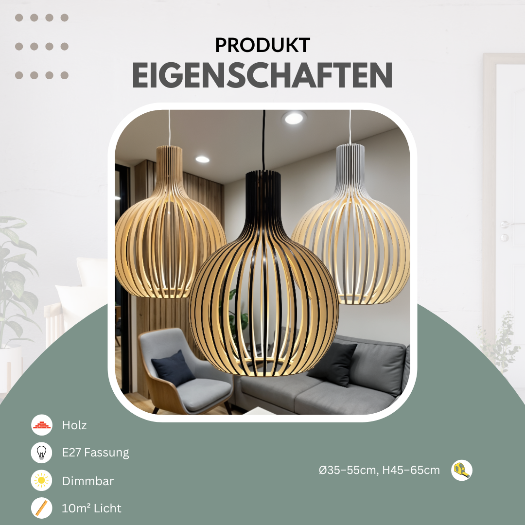 Diese Pendelleuchte aus Holz vereint zeitloses, minimalistisches Design mit wohnlichem warmweißem Licht und ist ideal für Esszimmer, Wohnzimmer, Flur oder Arbeitsbereiche. Mit mehreren Durchmesser‑Varianten (Ø 35 cm, Ø 45 cm oder Ø 55 cm) passt sie perfekt zu unterschiedlich großen Räumen und Einrichtungsstilen – von skandinavisch bis modern.