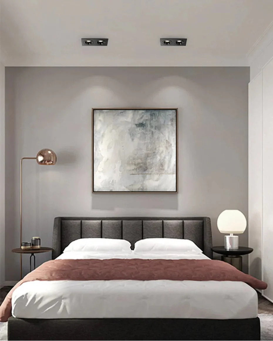 Die Deckenstrahler sorgen für gezieltes, funktionales Licht. Die Spots lassen sich individuell ausrichten, sodass Bereiche wie Bilder, Sitzgruppen oder Arbeitsflächen optimal ausgeleuchtet werden können.